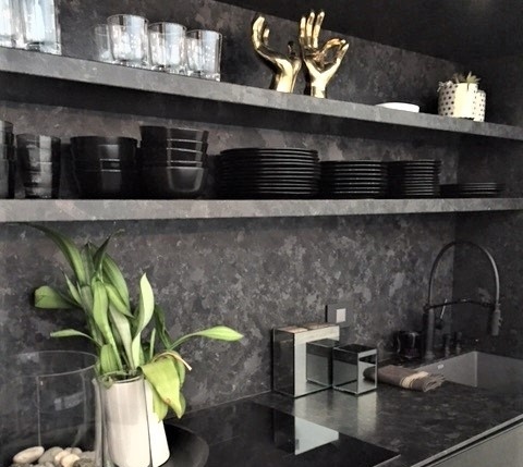 ألواح الجدران والأسقف الكاملة رائجة، إذ يتزايد إقبال المصممين على إبراز الجرانيت والرخام بهذه الطريقة. تُعد الألواح الخلفية الكبيرة مثاليةً لاستخدام هذا الأسلوب في المطابخ خلف الأحواض وأفران الطهي.